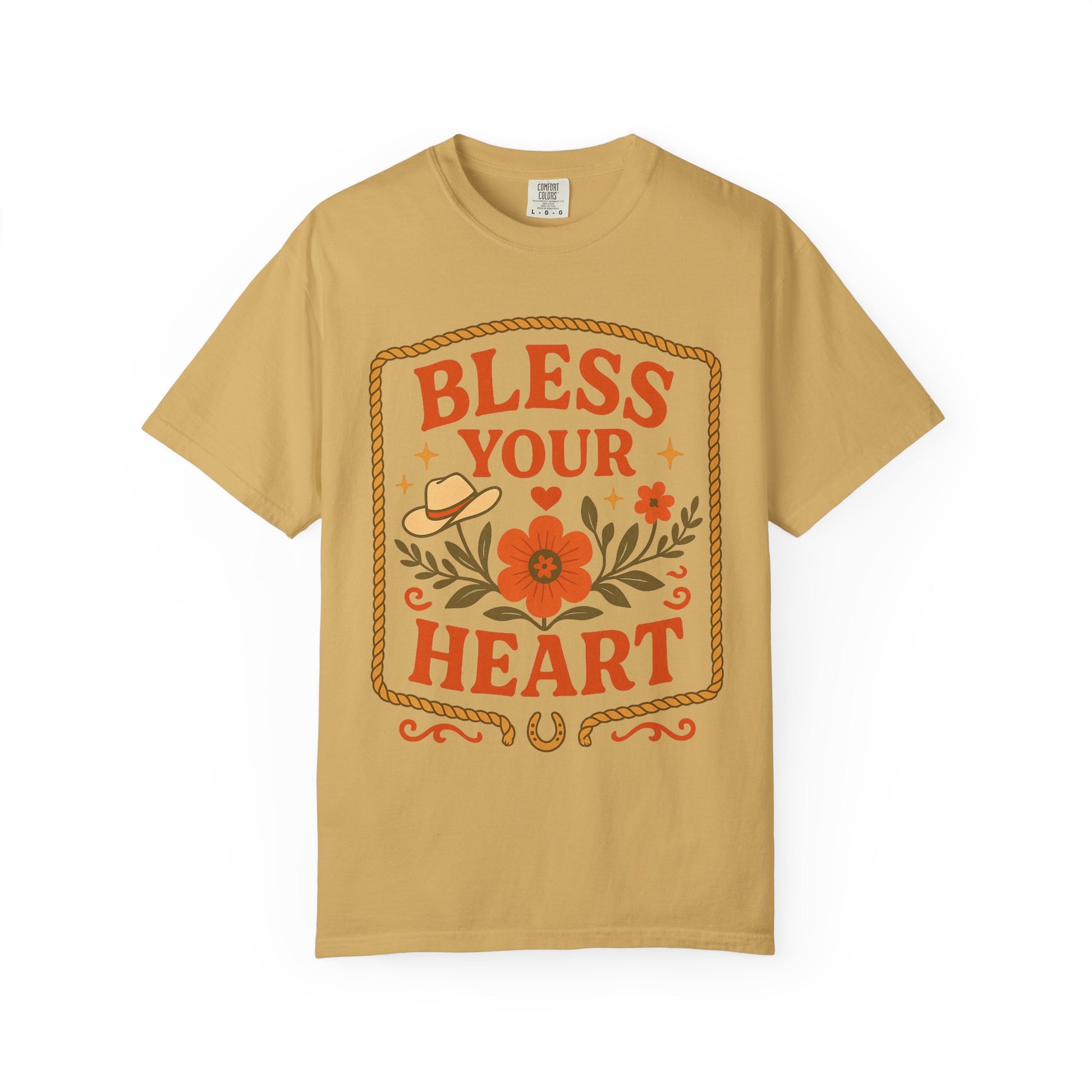 Soft, lived-in comfort meets warm Southern charm. This garment-dyed tee wears in like an old favorite—slightly faded, wonderfully soft—so the cheerful “Bless Your Heart” design feels like something you’ve loved for years. Earthy reds, mustard gold and muted green florals sit inside a stitched-frame motif with a tiny cowboy hat and horseshoe accent. The relaxed cut and midweight cotton make it an easy everyday layer for porch mornings, farmers’ market runs, or slow drives down country roads. It’s for people who speak in kind smiles, vintage vinyl, and sun-warmed coffee; a shirt that feels friendly, familiar, and quietly stylish.