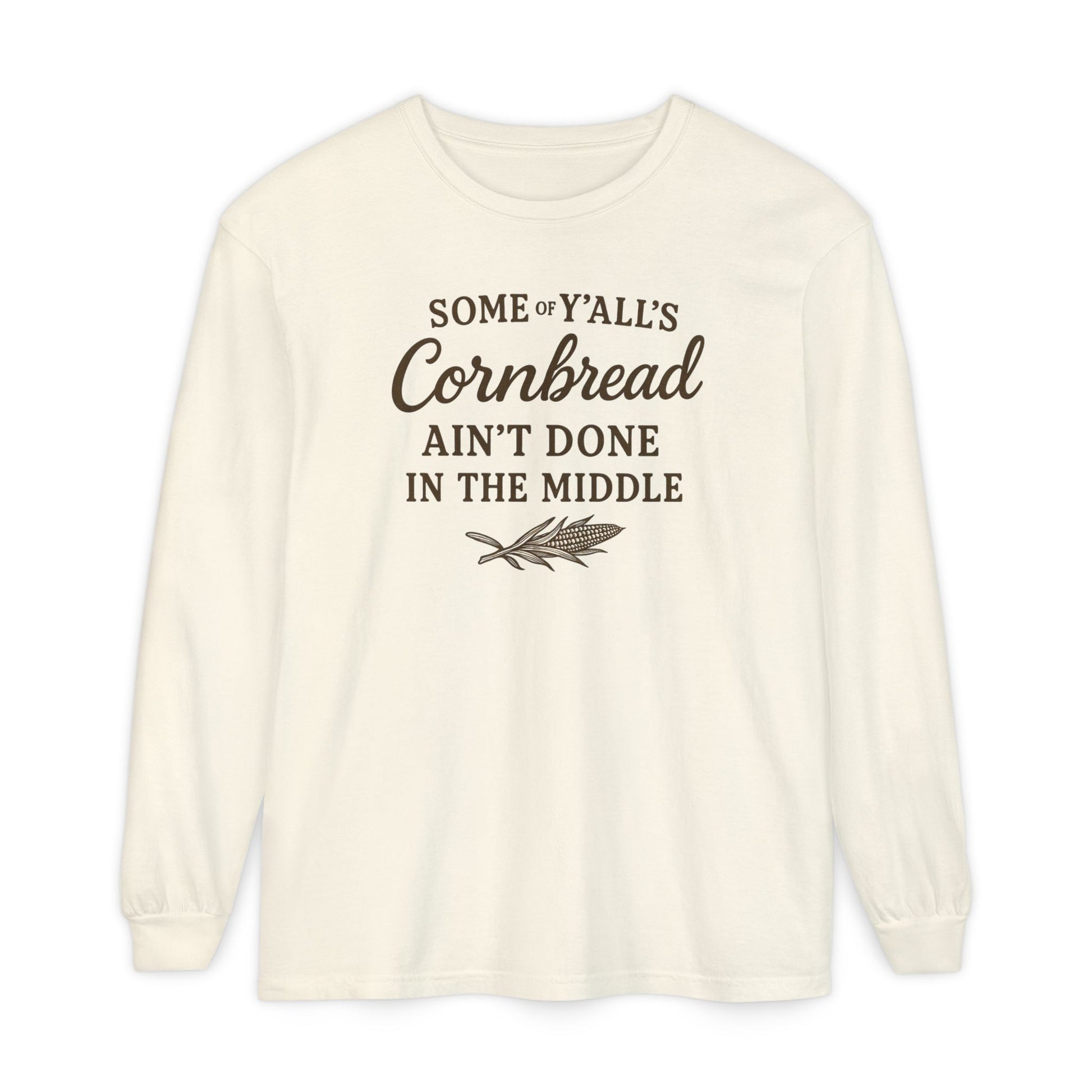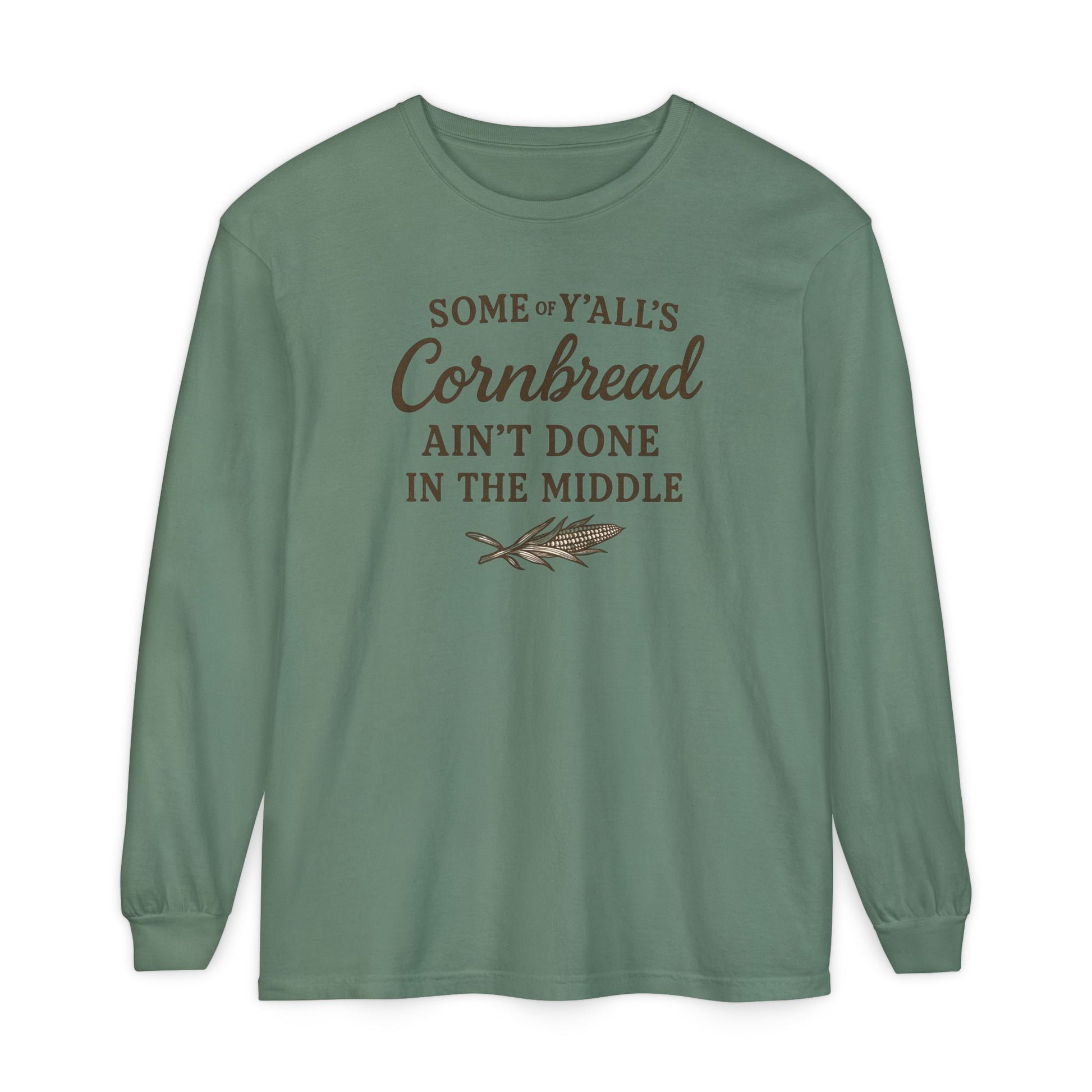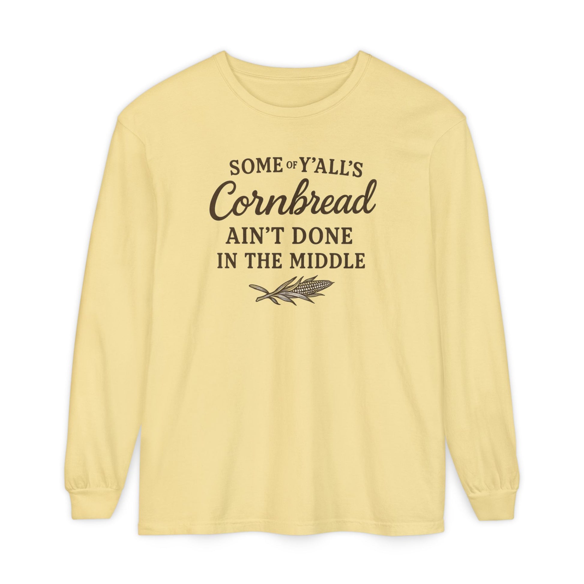 Embrace southern humor with this unisex garment-dyed long sleeve t-shirt. The relaxed fit and soft, lived-in feel make it perfect for cozy days at home or engaging outings with friends. Ideal for anyone who values quality and casual fashion, this t-shirt is perfect for both men and women alike. It’s a great gift for holidays like Thanksgiving, where warmth and togetherness are celebrated. Whether you're enjoying a family gathering or a festive dinner, this shirt adds a delightful touch to your look. It fits seamlessly into any laid-back wardrobe, making it a must-have for every occasion. Funny southern humor, some of ya'lls cornbread ain't done in the middle.