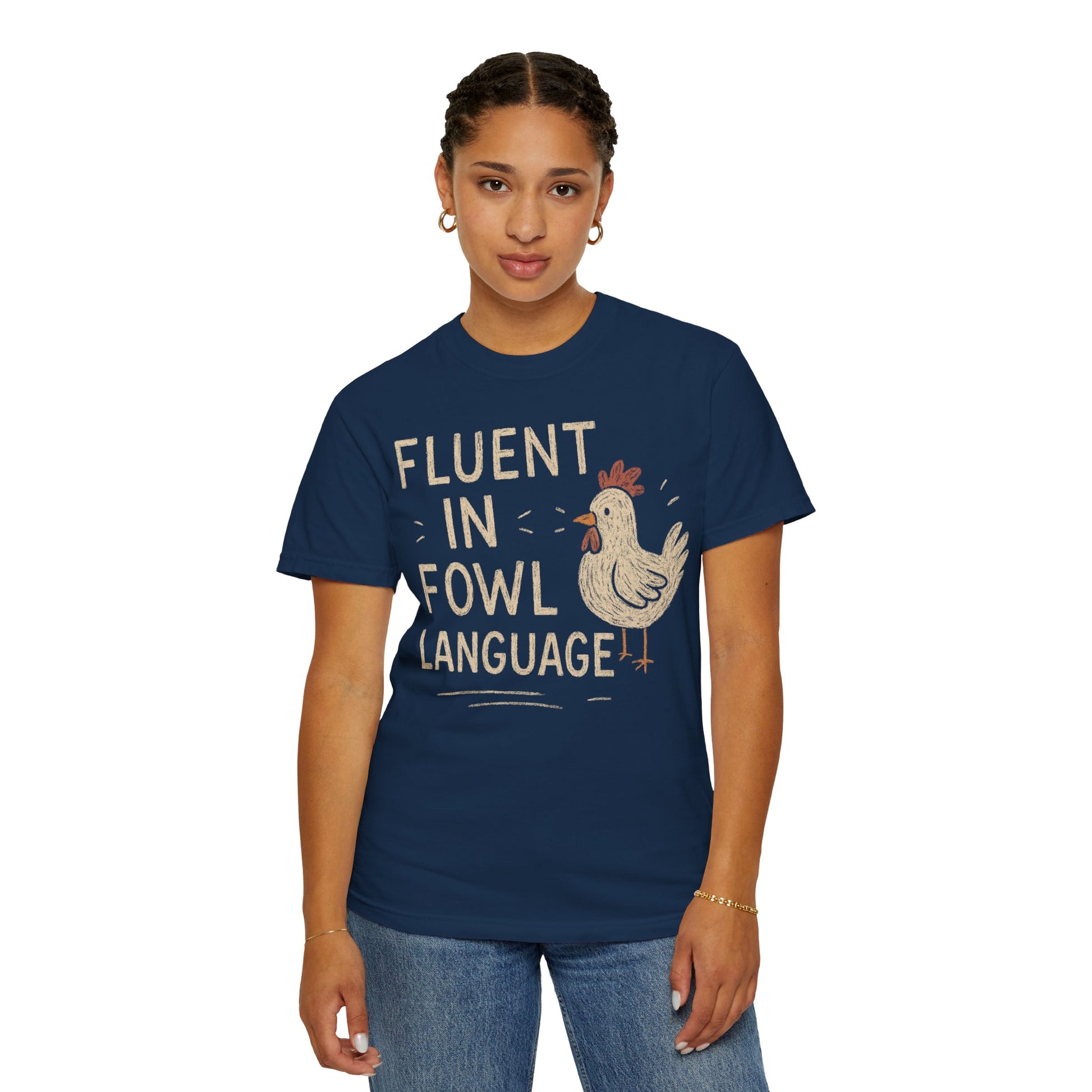 Funny Chicken Lover Unisex Garment-Dyed T-shirt, Fluent in Fowl Language Tee, Chicken Humor Shirt, Comfort Colors Top, Gift for Poultry