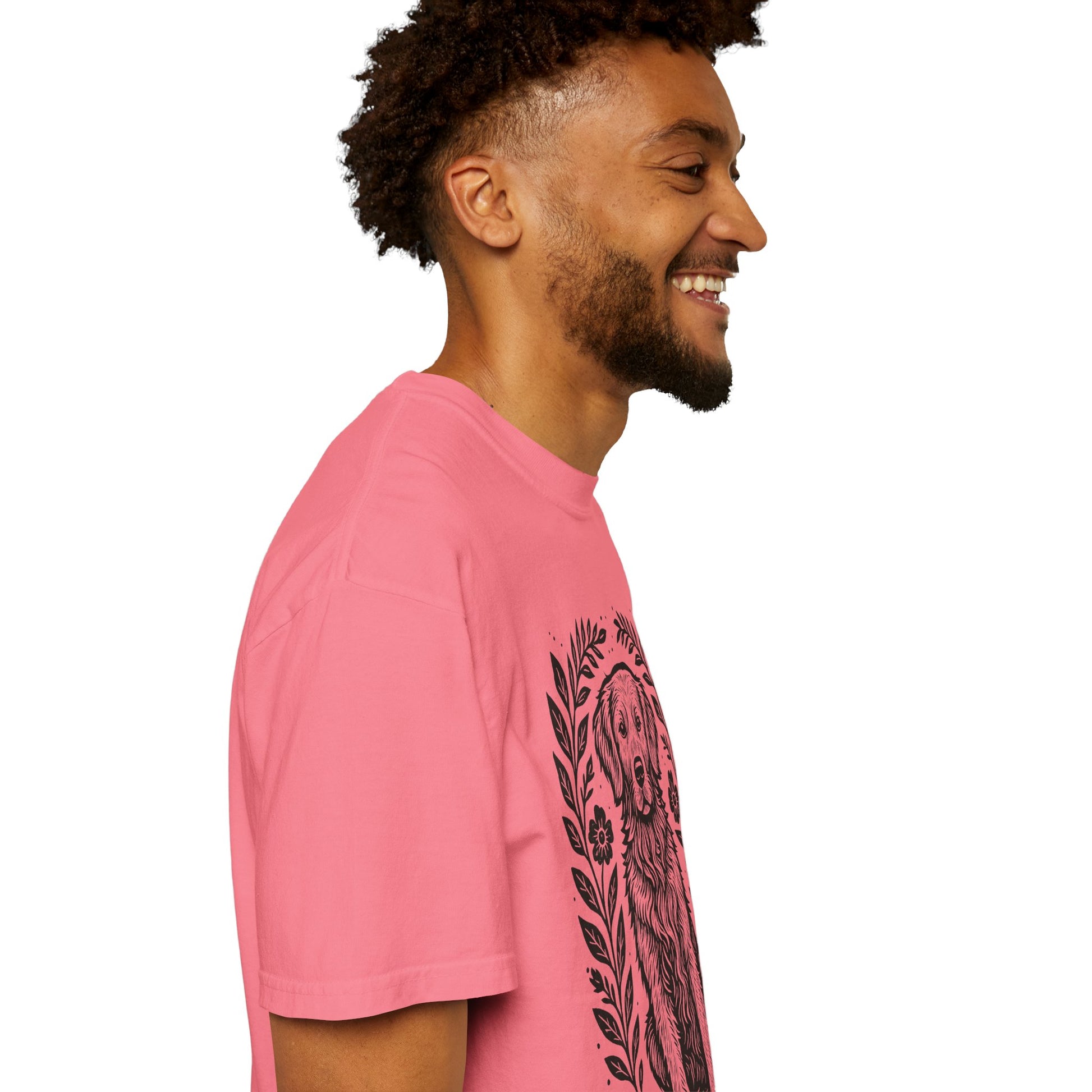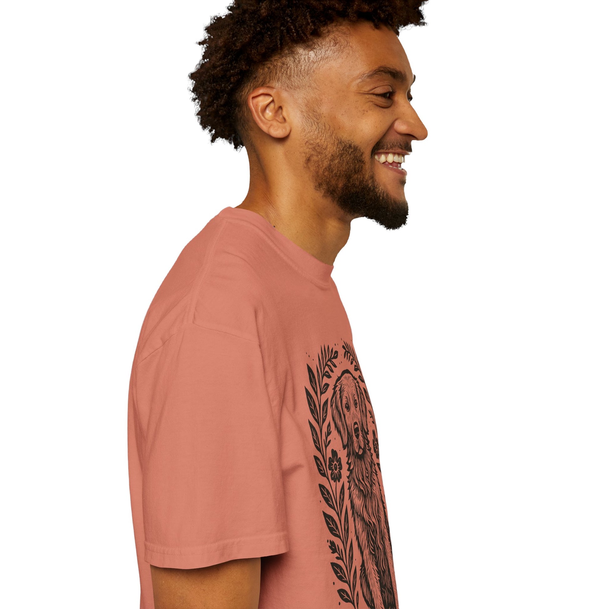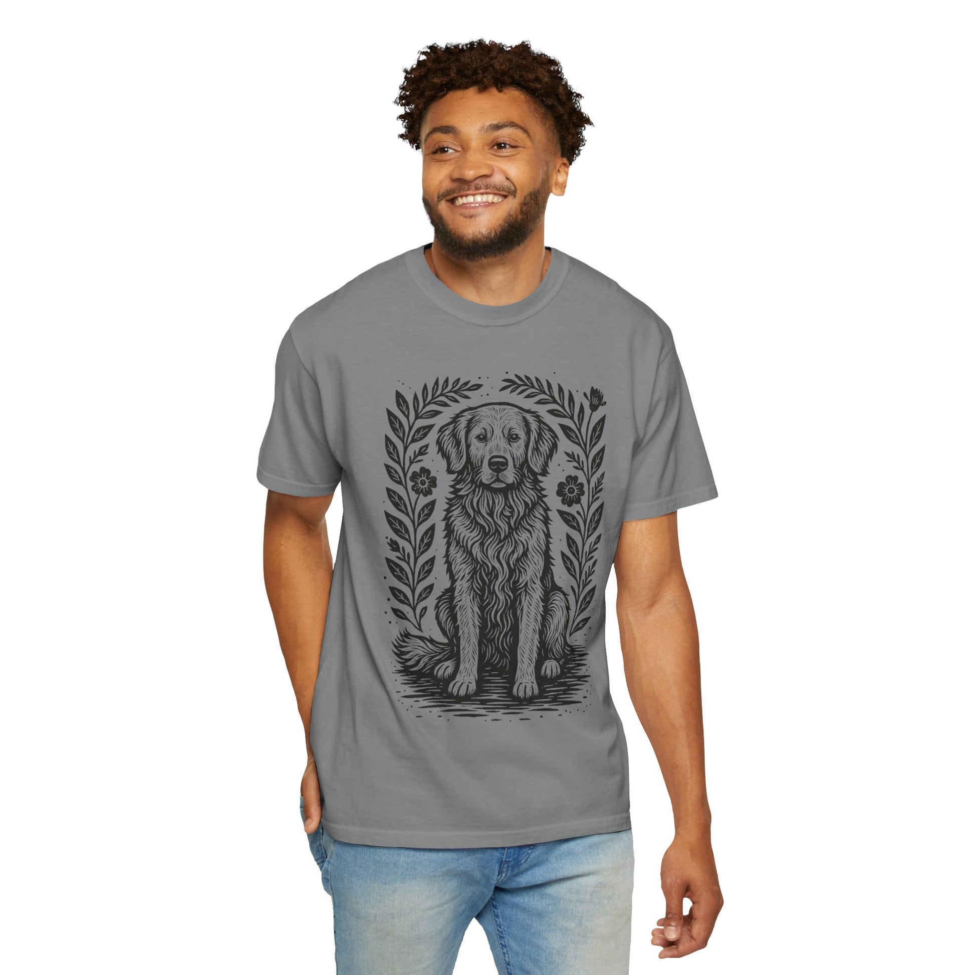 This garment-dyed tee feels like a quiet afternoon with a loyal dog at your feet. The hand-drawn retriever sits framed by delicate foliage—detailed, calm, and honest. The soft, washed-in color of the fabric gives the illustration a lived-in look that pairs easily with jeans or a favorite jacket. Wear it on weekend walks, at the park, or at home when you want something comfortable that still reads thoughtful. The relaxed fit and medium-weight cotton hold the print without feeling heavy; over time the tee softens and becomes more personal, like an old companion.