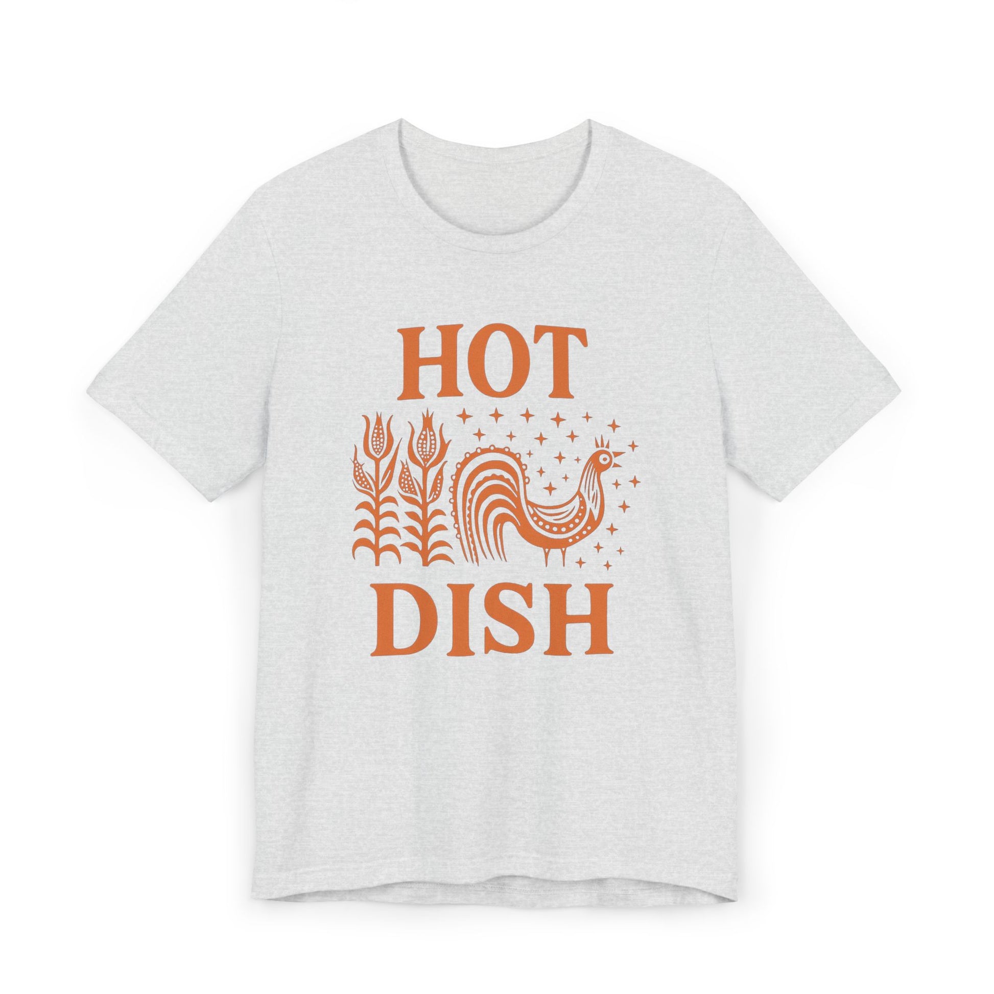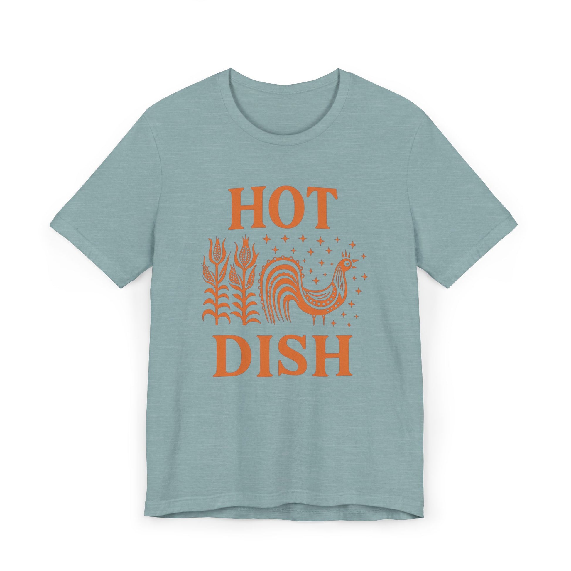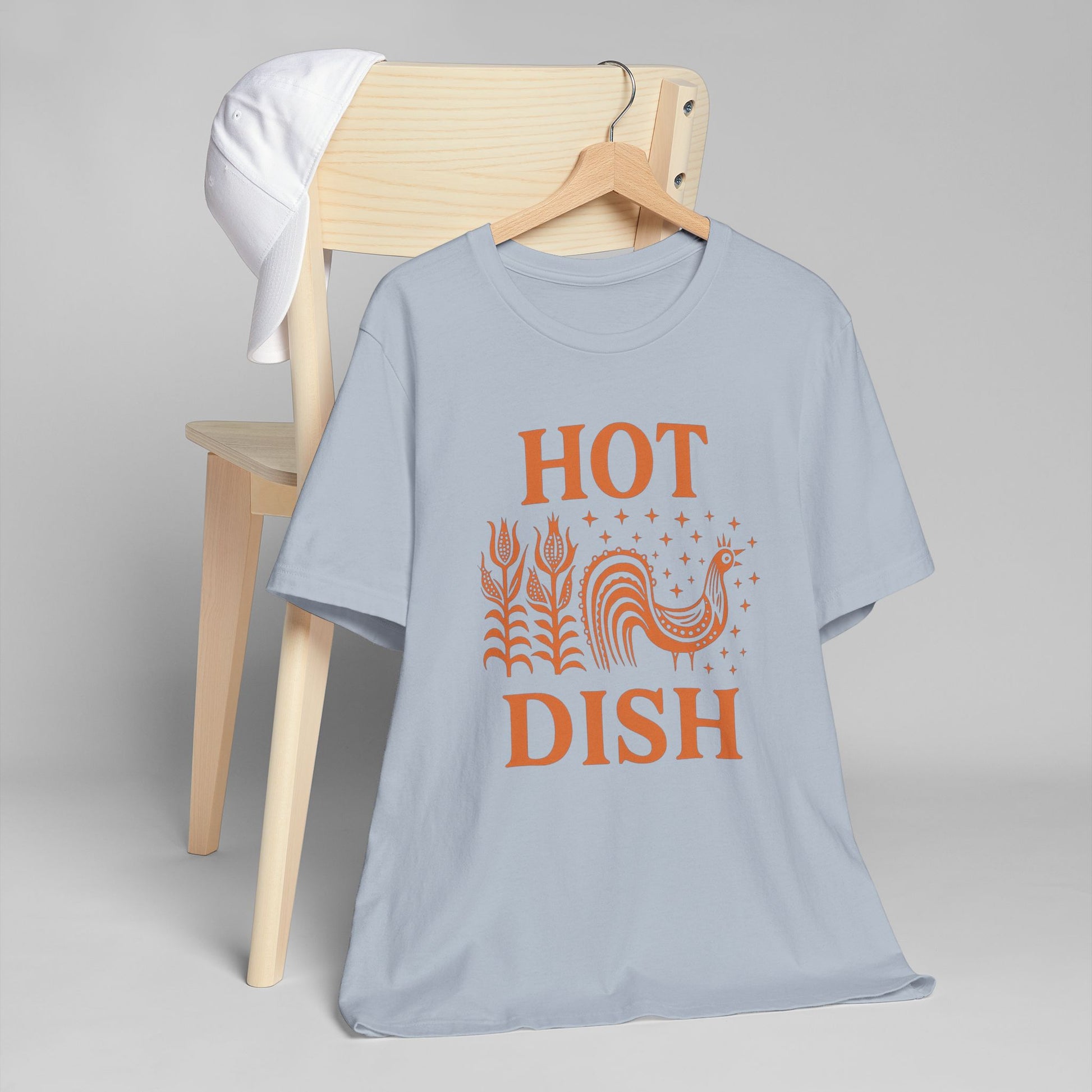 Lightweight and laid-back, this tee brings a warm, playful wink to everyday wear. The soft, breathable cotton drapes easy across the shoulders while a neat crew neckline and retail fit keep the silhouette tidy without feeling stiff. The vintage-inspired orange graphic — a proud rooster, stylized wheat stalks, and the cheeky “HOT DISH” lettering — feels like a sunny midwest kitchen, late-afternoon light, and laughter around a well-worn table. Wear it to potlucks, drive-in diners, or slow Sunday mornings when you want comfort with a bit of regional charm. Pairs naturally with denim, layered under an open flannel, or rolled-sleeve casual for a quick run to the market. Product features - Super lightweight, highly breathable 100% combed and ring-spun cotton (composition varies by color) - Ribbed knit crew collar with seam for shape retention - Side seams and shoulder tape for structural support and durability - Retail fit that layers well and stays comfortable for everyday wear - Tear-away label (note: fulfillment may apply a generic printed neck label) Care instructions - Machine wash: cold (max 30C or 90F) - Non-chlorine: bleach as needed - Tumble dry: low heat - Iron, steam or dry: low heat - Do not dryclean