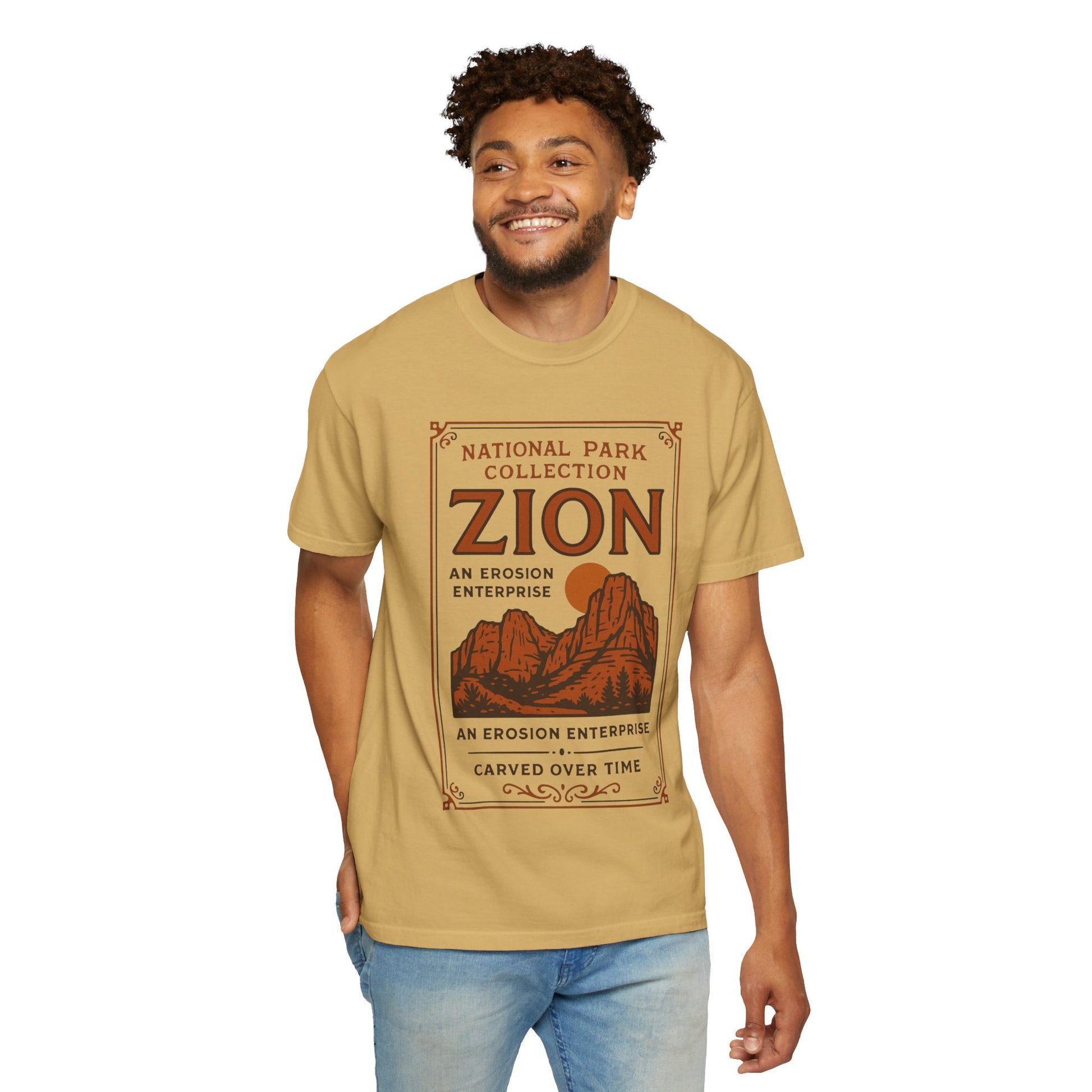 This garment-dyed tee brings a piece of Zion’s red-rock drama into everyday wear. The soft, lived-in fabric and retro park-poster artwork invite slow afternoons, trailhead photos, and evenings around a low campfire. Comfortable and slightly relaxed, it layers easily beneath a jacket or stands alone with worn jeans. The muted, earthy print feels quiet and intentional — for people who know the pull of sandstone ridgelines and want that memory stitched into their wardrobe.